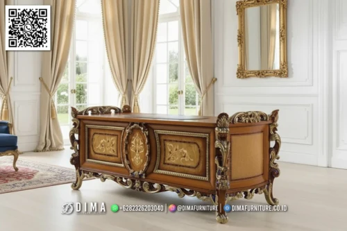 Selain tampil mewah, meja ini juga dirancang agar tetap fungsional untuk kebutuhan kerja modern. Permukaannya luas, ideal untuk menulis, meletakkan komputer, atau mengatur dokumen penting. Setiap ukiran di sisi meja dipahat dengan teliti, mencerminkan keahlian dan ketelitian tangan pengrajin jepara. Dengan konstruksi yang kuat dan kokoh dari kayu jati solid, meja ini tidak hanya indah dipandang, tetapi juga tahan lama untuk penggunaan jangka panjang.