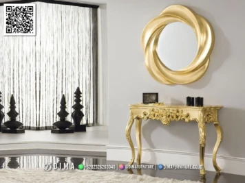 Produk ini mengusung desain klasik yang dipadukan dengan sentuhan modern, menjadikannya mudah masuk ke berbagai gaya interior. Meja konsol mewah ini dibuat dengan material kayu berkualitas, dipermanis dengan finishing emas yang menawan, serta dilengkapi cermin berbingkai unik yang membuat tampilan semakin elegan.