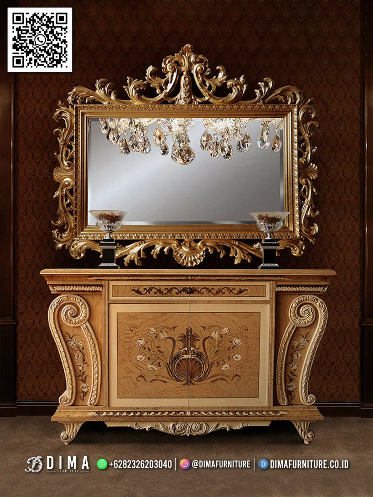 Produk ini dibuat dari material kayu solid berkualitas tinggi, diproses dengan finishing gold leaf untuk tampilan yang eksklusif. Cermin besar dengan bingkai ukiran serasi melengkapi tampilannya, cocok diletakkan di ruang tamu, lorong, atau area foyer rumah Anda. Dengan ukuran yang proporsional, meja ini juga fungsional sebagai tempat pajangan dekoratif seperti vas bunga, lilin aromaterapi, atau aksesoris rumah lainnya.