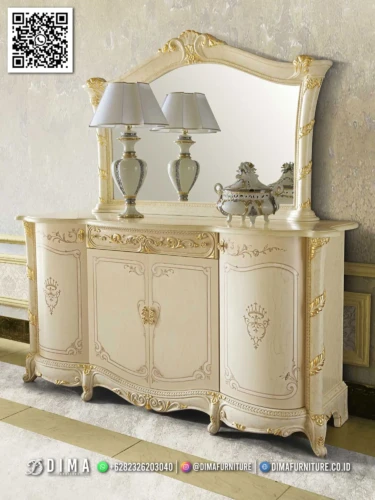 Tampilan ukiran halus di bagian pintu dan kaki meja memberi kesan detail tanpa terlihat berlebihan. Perpaduan warna ivory yang soft dengan aksen emas membuat meja ini cocok dipadukan dengan berbagai jenis dekorasi, baik di ruang tamu, lorong, maupun kamar tidur.