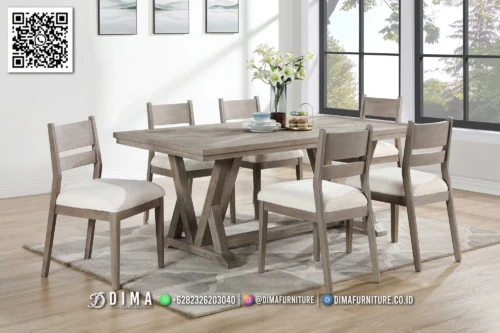 Selain tampilannya yang menarik, set meja makan minimalis ini juga dirancang untuk penggunaan sehari-hari. Permukaan meja cukup luas untuk menata berbagai hidangan, sementara kursinya dibuat dengan dudukan empuk agar tetap nyaman saat digunakan dalam waktu lama. Hal ini membuat meja makan kayu minimalis cocok digunakan untuk makan bersama keluarga ataupun sekadar berkumpul santai.