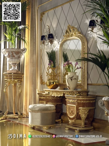 Dengan ukuran yang proporsional, meja rias mewah ini tetap terlihat rapi meski ditempatkan di ruangan yang tidak terlalu luas. Perpaduan desain klasik mewah dan fungsi modern menjadikannya investasi furniture yang layak untuk jangka panjang.