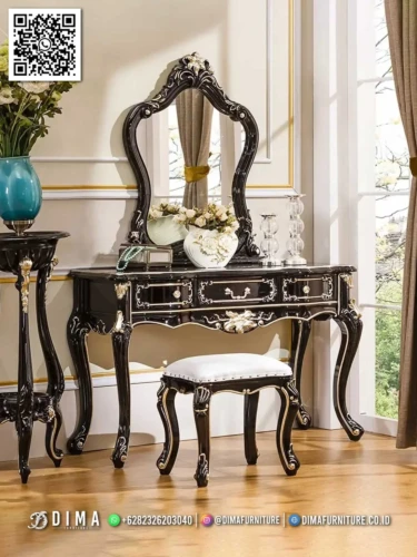 Meja rias mewah dima royal black gold elegan, furnitur klasik berkelas dengan ukiran indah, cermin elegan, dan sentuhan mewah black gold.