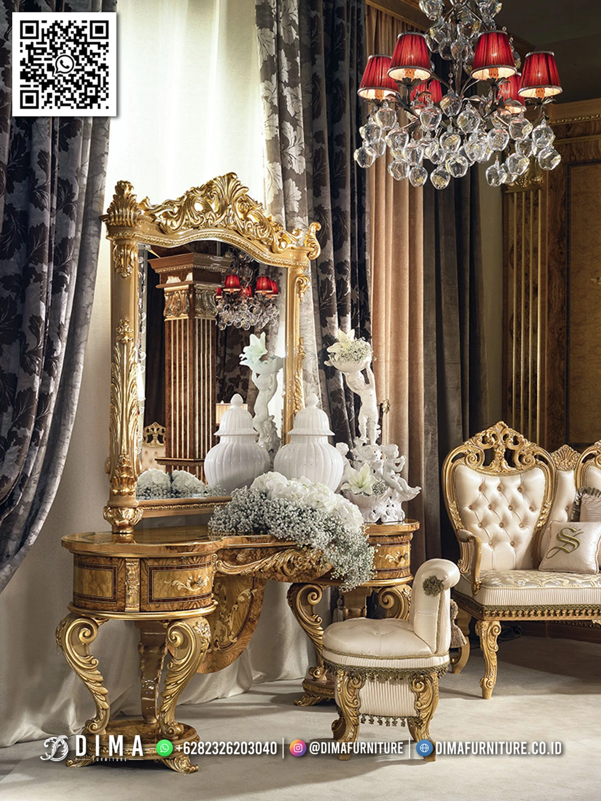 Struktur meja rias mewah ini kokoh dan stabil, nyaman digunakan untuk aktivitas harian. Perpaduan desain klasik dan fungsi modern membuatnya tidak hanya cantik, tapi juga praktis.