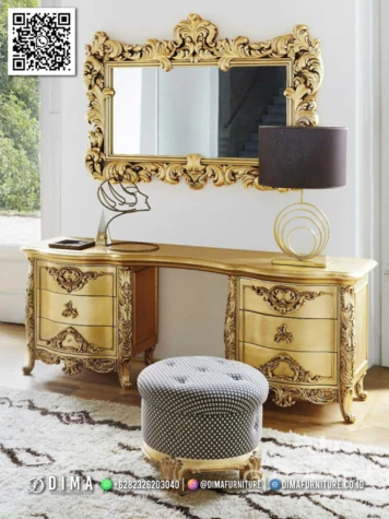 Meja rias premium dima royal classic gold indah, pilihan sempurna untuk hunian bergaya mewah dengan ukiran klasik, cermin besar, dan nuansa elegan.
