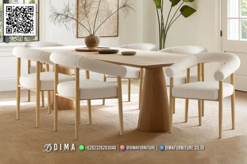 Set meja makan minimalis putih natural elano premium, pilihan tepat untuk ruang makan modern dengan desain simpel, warna lembut, dan bahan kayu solid.