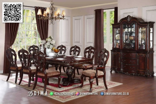 Set meja makan mewah klasik ukiran jati halbert hadir dengan desain elegan, ukiran rapi, dan bahan kayu jati solid untuk ruang makan.