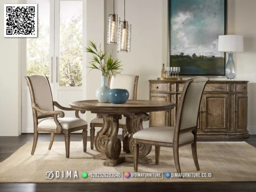 Mejanya hadir dengan desain bundar yang membuat aktivitas makan jadi lebih akrab. Kaki meja bergaya klasik memberikan tampilan kokoh, sementara finishing matte yang lembut membuatnya tampak elegan tanpa kesan berat. Kursi-kursinya dirancang dengan sandaran empuk dan bentuk ergonomis, sehingga nyaman saat digunakan untuk makan, bekerja, atau sekadar duduk berbincang.