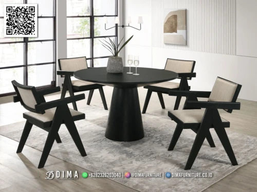 Set meja makan minimalis jati cailie best seller hadir dengan kayu jati kuat, desain bulat modern, dan kursi nyaman untuk ruang makan minimalis.