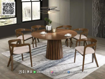 Set meja makan minimalis jati sora – modern premium dengan desain bulat yang nyaman. Terbuat dari kayu jati solid, cocok untuk ruang makan.