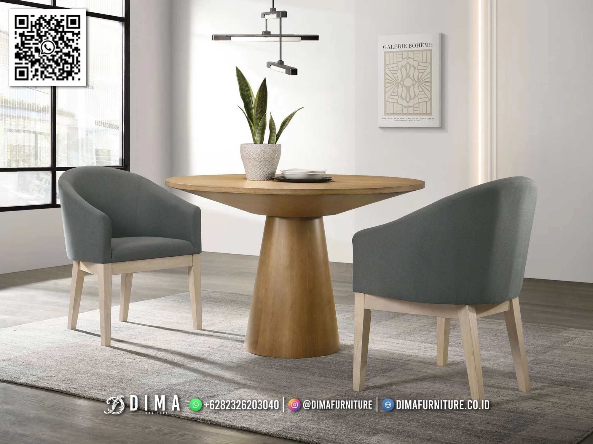 Meja bundar dengan kaki tengah ini juga memberikan ruang gerak yang lebih fleksibel. Tidak ada sudut tajam, sehingga aman dan ramah untuk keluarga dengan anak kecil. Model seperti ini juga sedang banyak dipilih karena memberikan nuansa lebih hangat dan mengundang ketika digunakan sebagai meja makan modern, meja makan harian, ataupun meja untuk menerima tamu.