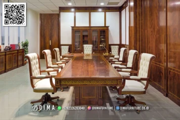 Set meja rapat mewah kayu jati jepara dengan desain klasik elegan, menghadirkan kesan berkelas dan nyaman untuk ruang pertemuan penting.